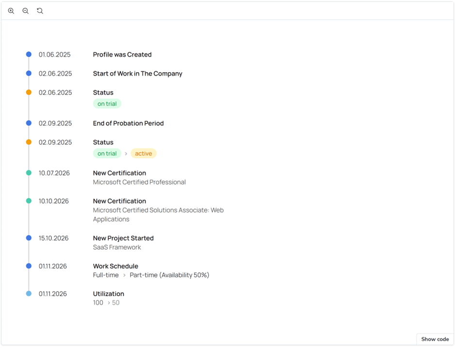 The example below illustrates how timeline data is visually structured and presented within the component.